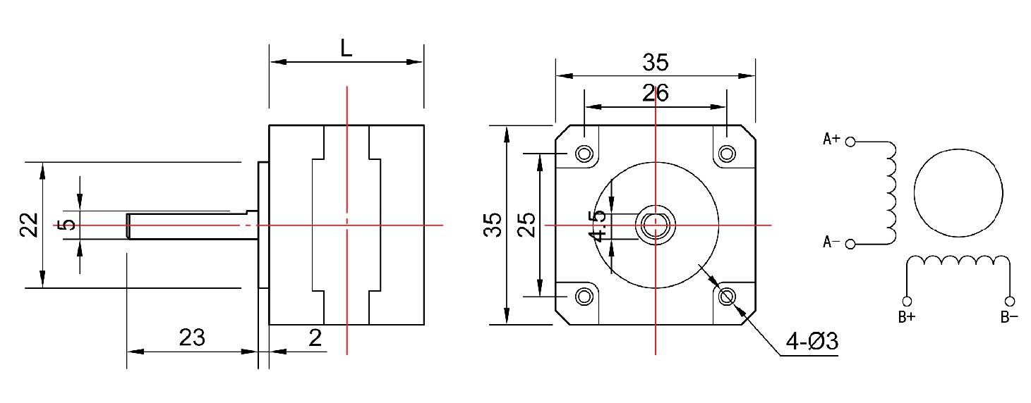 35HBP44BL4-TF0两相混合式步进电机,机身高44MM,扭矩0.25N.m,电流1A,轴径Φ5MM,圆轴,轴长25mm,可根据客户要求定制,广泛适用范围于激光、医疗、纺织、安防等行业。