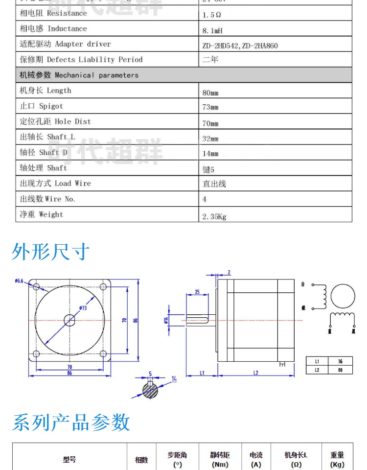4.步进电机命名的误区 目前国内步进电机的命名方式可谓多种多样,没有一个统一的国标,各个厂家都以自己的方式命名,有很多客户直接会问有没有什么什么型号的步进电机,如果想找到一模一样命名方式的电机替代,只有找原厂家。其实各个厂家步进电机都是一样的,只是名字不同,我们只要抓住关键参数,法兰边长,保持转矩,电机机身长度,步距角就可以确定可以替代的电机了 5.步进电机基本步距角与细分之间的误区 步进电机的细分技术实质上是一种电子阻尼技术,其主要目的是减弱或消除步进电机的低频振动,提高电机的运转精度只是细分技术的一个附带功能。细分后电机运行时的实际步距角是基本步距角的几分之一。(两相步进电机的基本步距角是1.8°,即一个脉冲走1.8°,如果没有细分,则是200个脉冲走一圈360°,细分是通过驱动器靠精确控制电机的相电流所产生的,与电机无关,如果是10细分,则发一个脉冲电机走0.18°,即2000个脉冲走一圈360°,电机的精度能否达到或接近0.18°,还取决于细分驱动器的细分电流控制精度等其它因素。不同厂家的细分驱动器精度可能差别很大;细分数越大精度越难控制。以次类推。三相步进电机的基本步距角是1.2°,即一个脉冲走1.2°,如果没有细分,则是300个脉冲走一圈360°,如果是10细分,则发一个脉冲,电机走0.12°,即3000个脉冲走一圈360°,以次类推。