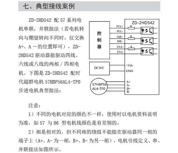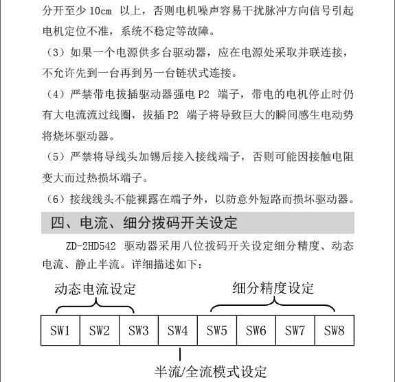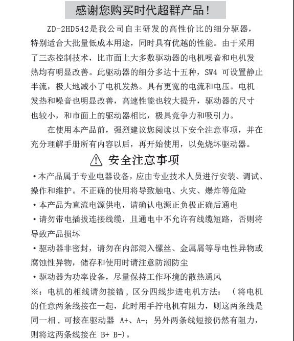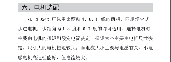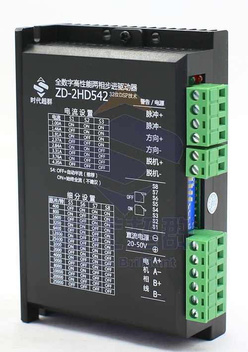 ZD-2HD542为一款等角度恒力 矩细分型驱动器,驱动器电压直流24-58V,适配电流在4.2A 以下,外径 42,57MM 的各种型号的二相混合式步进电机。该驱动器内部采用类似伺服控制原理的电路, 此电路可以使电机低速运行平稳,几乎没有震动和噪音,电机运转平稳,发热小步进脉冲停止超过 100m/s, 驱动器电流自动减半。定位精度****可过 25600 步/转。 24-50V 直流供电,适应最恶劣电网环境 H 双极恒相流细分驱动