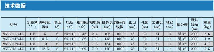 电机技术参数: 型 号:86EBP181ALC 步 距 角:1.8度 相 数:2 电 流:6.0A 电 阻:0.52Ω 电 感:4.16mH 转矩:12.5Nm 机 身 长:181mm 编 码 器:1000P
