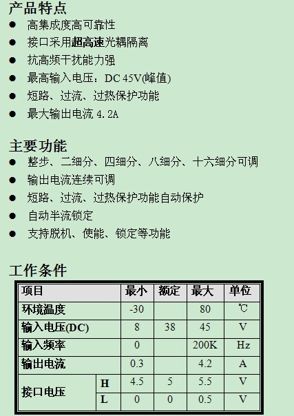 驱动器所用芯片:TB6600HQ\HG 【产品名称】 TB6600HQ/HG东芝****上市产品 【产品类别】 步进电机 【产品用途】 步进电机驱动IC 【产品规格】 HZIP25 【生产厂家】 TOSHIBA 【产品说明】 PWM斩波型双极性步进电机驱动器IC TB6600HQ/HG是一个单芯片PWM斩波型双极性正弦步进电机微步驱动。 可控制2相步进电机正向和反向旋转, 带有1-2相, W1 -2相2W1 -2相, 4W1 -2相励磁模式。 只需时钟脉冲信号就可以驱动两相双极型步进电机实现低振动,高效率工作。【产品特点】 •单芯片双极性正弦微步步进电机驱动器 • ****BiCD 0.13 nm工艺 •高达50V耐压 •导通电阻(上+下) = 0.4 Ω •正向和反向旋转控制 •5种细分模式可选(1/1 ,1/2 ,1/4 ,1/8 , 1/16步) •输出电流: IOUT = 5.0A(峰值,在100ms内 ) •额定输出:IOUT = 4.5 A •封装: HZIP25 - 1.00F •输入口内置下拉电阻: 100 KΩ •输出报警管脚电流 :Ialert = 1mA •输出监视管脚( MO ):Imo= 1mA •带有复位和使能引脚 •带有待机功能。 •突破传统的单电源供电 •内置过热保护( TSD )电路 •内置的欠压保护(UVLO)电路 •内置过电流检测( ISD),电路 锁定模式下TB6600HQ/HG电流与电压关系测试数据图: 电源电压38V时,可设在4.5A;