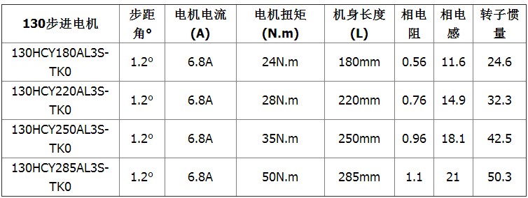 130步进电机步距角°电机电流(A)电机扭矩(N.m)机身长度(L)相电阻相电感转子惯量