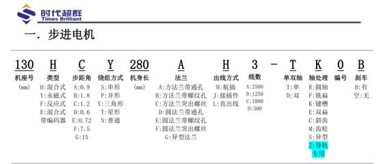 说明: 1、步进电机命名规则实施后,型号中将不再用括号标注;线数为有效出线数,线数为具体数字的时候表示具体出线数,为字母时表示编码器线数,不计空线,如 39-26 电机线数应该为 4; 2、任意一款电机做了细微改动后,如果命名规则无法体现则用不同编号表示,编号为数字的是通用产品,为字母或字母+数字的为定制产品。 3、轴处理 C 的为专门用于外接齿轮减速,轴处理 M 的专门用于外接 PL 行星减速;双出轴电机轴处理的命名以前面出轴为准 4、新增带编码器电机(即带反馈功能) 型号举例:60EBP84ALC-TF0 举例: 原 57BYG250-56(4 线,轴径 6.35)改为 57HBP56AL4-TF0; 产品新型号名称: