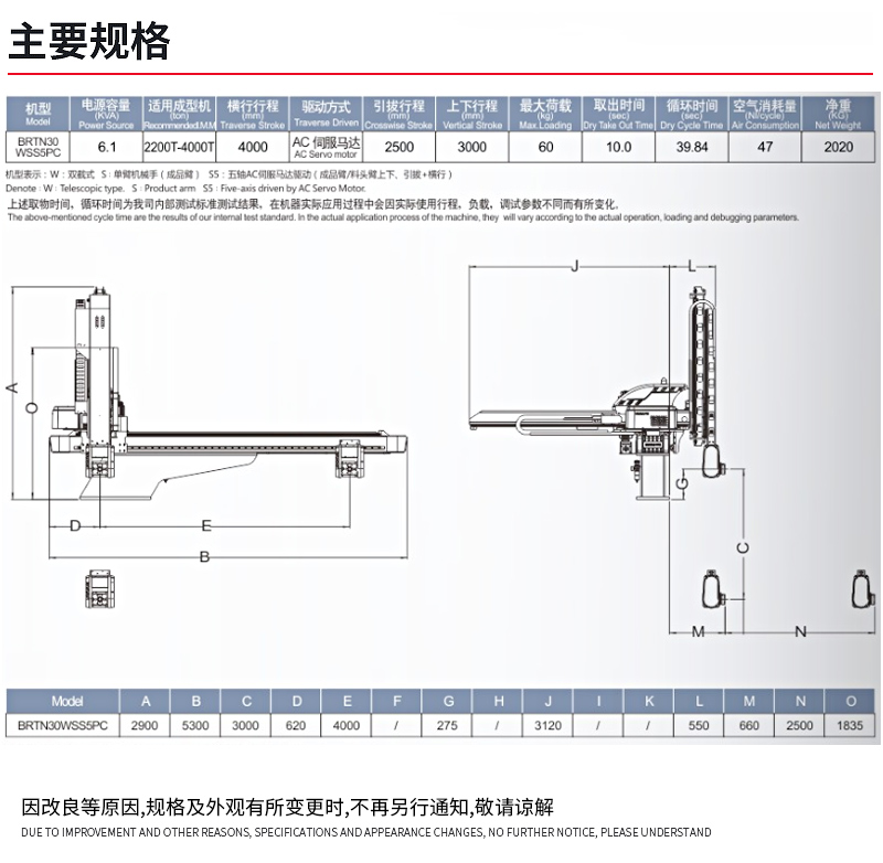 伯朗特BRTN30WSS5PC系列机械手适用于2200T 4000T的各种型塑胶射出成型机,五轴AC伺服驱动,标配AC伺服驱动轴,A轴旋转角360° ,C轴旋转角180°,可自由定位调整夹具角度,寿命长,精度高,故障率低,维护简单,主要用于快速取出或是复杂角度取出应用,特别是长形状产品如汽车产品,洗衣机家电产品。五轴驱控一体控制系统:信号线少,远距离通讯,扩展性能好,抗干扰能力强,重复定位精度高,可以同时控制多轴,设备维护简单,故障率少。