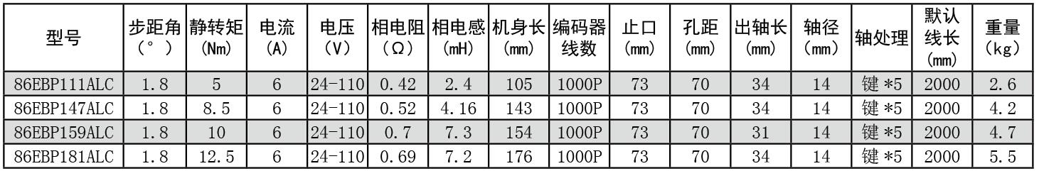86系列全数字闭环高速大扭矩伺服步进套装 编码器电机86EBP111ALC-TK0静转矩5.0Nm,编码器1000P。编码器线长和电机线长为2000mm。电流范围0~6A,电压范围AC18~80V/DC24~110V。