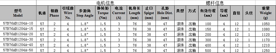 57B76AB1204A-10D直线步进电机100mm长梯形丝杠,电机机身长76mm,静转矩为1.5Nm,推力大致为900N,丝杠每增每增加100mm加30元,此款为双出轴电机,可以安装手轮等装置